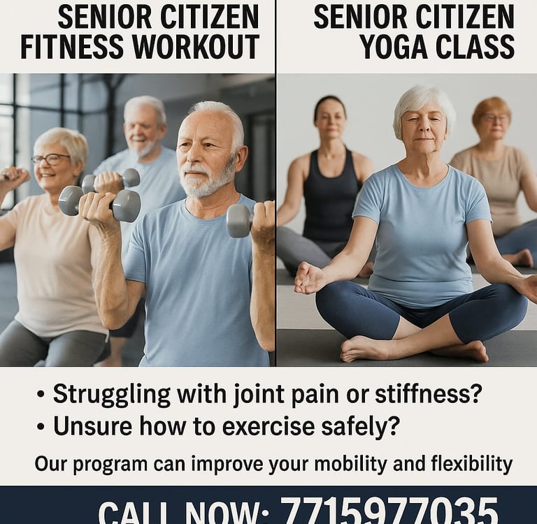 Worried about your aging parents' health? Or are you a senior looking to stay strong, flexible, and independent? Whether you live in Kukatpally, Banjara Hills, Gachibowli, or Dilsukhnagar, our Senior Yoga & Fitness Program in Hyderabad is designed specifically for 60+ adults seeking strength, balance, pain relief, and peace of mind — all under expert supervision.